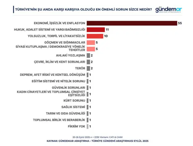 GÜNDEMAR Araştırma 20-26 Eylül tarihleri arasında yaptığı araştırmanın sonucuna göre katılımcıların yüzde 55’i Türkiye’nin en büyük sorunu olarak ekonomi, işsizlik ve enflasyonu gösteriyor.