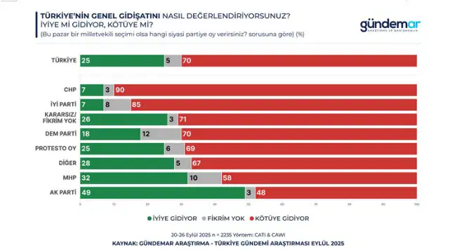 Katılımcıların yüzde 70’i Türkiye’nin genel gidişatını “kötüye gidiyor” olarak değerlendiriyor. Yalnızca yüzde 25 “iyiye gidiyor” diyor. AK Parti seçmeninin yüzde 49’u “iyiye gidiş”ten yana görüş bildiriyor. Ancak muhalefet seçmeninde tablo net; CHP’de yüzde 90, İYİ Parti’de yüzde 85 oranında “kötüye gidiyor” algısı hâkim. Toplumun genelinde moral düşük; yalnızca iktidar tabanında göreli bir iyimserlik mevcut.