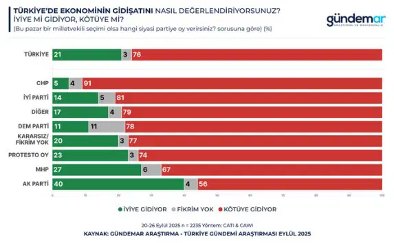 Muhalefet cephesinde tablo sert biçimde olumsuz; CHP’de yüzde 87, İYİ Parti’de yüzde 83, DEM Parti’de yüzde 78 kötüye gidiş algısı baskın.